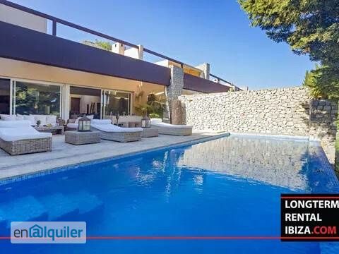 ANNUAL RENTAL - ROCA LLISA. Semi-detached Villa For Rent With Golf Views And Private Pool. Set within the exclusive and secure Roca Llisa community, this stunning semi-detached villa offers a unique combination of privacy, comfort and elegant design. With 450 m² of built space, the property features five spacious en-suite bedrooms, providing generous accommodation for families or groups seeking both style and functionality. An independent guest apartment with its own entrance adds further flexibility, ideal for visitors, staff or a private office space The expansive living and dining area is designed to make the most of the breathtaking golf course views, creating a peaceful and natural backdrop for daily living. The interior blends Balinese-inspired decor with warm wooden floors, giving each space a refined yet welcoming atmosphere. The large, fully equipped kitchen is perfect for entertaining and everyday living, allowing you to enjoy cooking and gathering in a functional and beautifully designed environment Outdoors, the villa features a private heated swimming pool and a tranquil chill-out area with a Balinese bed, perfect for unwinding under the Ibiza sun. The property has direct private access from the street and benefits from 24-hour security, ensuring peace of mind and a high level of comfort at all times Ideally located just three minutes from Cala Olivera beach and five minutes from the village of Jesús, you are also only eight minutes from Ibiza Town, offering quick access to the island?s vibrant cultural and social scene while enjoying the privacy and calm of a gated residential setting This is a rare opportunity to experience the relaxed luxury of Roca Llisa in a beautifully maintained home with every detail designed for year-round living. For more information or to arrange a visit, please contact with our agent.