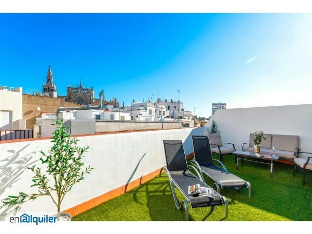 Arfe Terrace is a charming apartment with a private terrace, located in the heart of Seville, on the prestigious Calle Arfe, just a few meters from the Cathedral and the Archive of the Indies. The Arenal neighborhood is one of the most exclusive and vibrant areas of the city, known for its lively, safe, and cheerful atmosphere, with a wide variety of bars, terraces, restaurants, and small food shops. This apartment has been designed with neutral, elegant colors, creating a cozy and modern environment. It features two bedrooms: the first, an exterior room, comes with a double bed (1.50 x 2.00 m) and overlooks a small, picturesque patio, as well as large wardrobes. The second bedroom is equipped with a single bed, offering a large window and a balcony with views to the exterior. The living room is spacious, bright, and very comfortable, with two large balconies that allow plenty of natural light to flood the space. It is also furnished with a dining table for six people and a sofa bed. The open-plan kitchen, adjacent to the living room, is spacious and fully equipped with appliances and kitchenware to meet all guest needs. The bathroom is independent and spacious, ensuring maximum comfort. The highlight of the apartment is its private terrace, measuring around 20 m2, which is accessed by climbing two floors outside the apartment. The terrace is furnished with garden furniture, plants, and all the amenities needed to relax while enjoying stunning views of the Cathedral and Giralda. The booking of each (hidden) accommodation includes the offer of extra experiences or activities to improve your experience, which are managed by external providers, who will inform you by e-mail or (hidden), and you can contract or refuse them. For more information about the management of experiences and extra activities of the accommodations, please visit our Privacy Policy on our official website. ** For monthly stays, water and electricity supplies will be included up to a maximum of ? 100 per month. If the expenses are higher, the guest will have to pay the difference. The corresponding invoice will be sent by the accommodation to the guest to verify the expenses** During your stay, the access to the property is limited exclusively to the number of individuals specified at the booking process. Consequently, entry to the property is strictly prohibited for persons not registered as guests. Failure to adhere to this rule will result in an additional charge amounting to 50% of the total cost of the stay as a penalty, or alternatively, immediate expulsion from the accommodation.