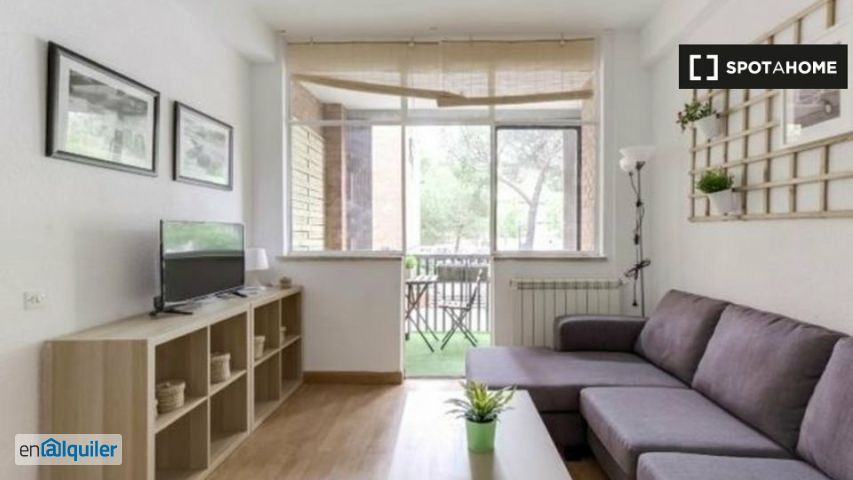 Se trata de un amplio piso perfecto para estudiantes y jóvenes profesionales, recién reformado y completamente amueblado, muy cerca al centro de Madrid, rodeado de zonas ajardinadas y muy bien comunicado con Ciudad Universitaria. Es un apartamento de tres habitaciones, un baño, salón, un pequeño balcón, una pequeña zona de comedor para cuatro personas y cocina equipada e independiente con cocina, horno, microondas, vajilla, una lavadora. Todos, cuentan con armarios, mesas de estudio con lámpara, juego de sábanas y toallas. El piso está ubicado cerca de la parada de metro de Antonio Machado (línea 7). Además, tiene una parada de autobús a metros escasos (línea 132 que te lleva hasta Ciudad Universitaria). La zona posee una gran variedad de comercio como supermercados, farmacias o restaurantes con las que se puede cubrir cualquier tipo de necesidad.