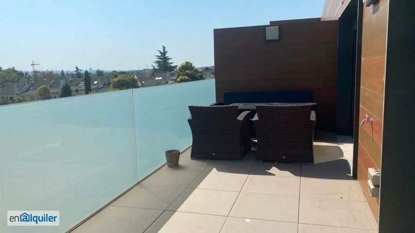 AKASA Alquila en Pozuelo: ESPECTACULAR Ático-Dúplex de 3 FANTASTICOS dormitorios. En planta principal: IMPRESIONANTE Hall de entrada, MAGNIFICO salón, GRAN cocina con office, dormitorio con cuarto de baño en suitte y preciosa terraza con acceso desde la cocina y desde el salón. Orientación ESTE, con vistas despejadas. En plante superior: 2 dormitorios con dos cuartos de baño, el principal en suitte con vestidor y solarium. Urbanización de CAPRICHO con calidades únicas. VIGILANCIA 24H. Piscinas, paddle, gimnasio, sala de reuniones, 1 plaza de garaje. Todos los servicios, transportes y comunicaciones a píe de calle.