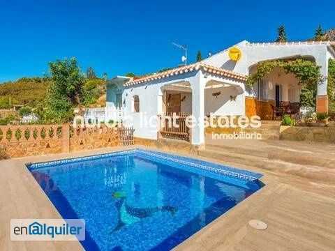 ¡No para larga temporada! Solo alquiler de invierno 2026/27. Reserva ahora! Precioso chalet cerca de Frigiliana para alquiler de invierno.   Disponible desde 1 de noviembre 2026 hasta el 15 de abril 2027.   En solo una planta, sin peldaños de escalera.   Una gran oportunidad para vivir en esta gran zona, a tan solo 2,8km de Frigiliana.   Acceso completamente hormigonado. El chalet tiene mucho espacio exterior, piscina privada, porche, terraza, barbacoa... todo lo necesario para disfrutar del buen clima de la zona.   La villa tiene tres dormitorios y dos baños, ambos con una gran ducha.   Aire acondicionado en todas las habitaciones y en el salón.   Hay dos salones, uno independiente y otro con la gran cocina. ¿Tienes visitas? No te preocupes tienes aparcamiento para tres coches, tal vez dos si son muy grandes.   Disfruta de las vistas al mar y de la paz y tranquilidad del campo. ¡Las mascotas son bienvenidas! Bajo fianza extra.   El agua, internet, mantenimiento de la piscina y las tasas de basura están incluidos en el precio del alquiler. Solo electricidad a parte.   Un mes de fianza.     Frigiliana un pueblo perteneciente a la provincia de Málaga. Muy próximo a la localidad de Nerja.   Es un pueblo ?blanco? único por su suelo empedrado y por la decoración floral de sus calles. Con vistas hacia la Sierra de Almijara magníficas. Un paseo por las calles denominadas Zacatín, Alta y Santo Cristo desvelan los detalles que hacen Frigiliana una localidad verdaderamente acogedora. Sin duda, la esencia de Frigiliana es rústica. Los atractivos turísticos más populares de Frigiliana son sus miradores, la Iglesia y el Palacio de Los Condes. Además, una antigua aldea llamada Azebuchal (perteneciente al pueblo de Cómpeta) se encuentra muy próxima a Frigiliana, convirtiéndose también en una visita obligatoria. La festividad más sonada de Frigiliana es la que recibe el nombre: Festival de Las Tres Culturas. Se trata de un gran evento que atrae a numerosos visitantes. Sin olvidar sus grandes atractivos gastronómicos, la miel de caña y el aguacate.  .