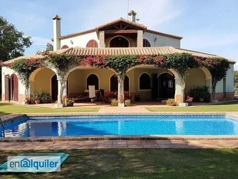 JULIO Mes entero 23.000? - 15 días 15.000? / AGOSTO Mes entero 30.000? - 15 días 20.000? Magnifica y lujosa villa individual de 5 dormitorios, y situada dentro de la exclusiva urbanización de ´Altos de Valderrama?, junto del famoso campo de golf de Valderrama. La distribución es la siguiente: Porche de entrada, gran vestíbulo a doble altura con aseo de cortesía, gran salón con chimenea y acceso a la gran terraza cubierta, comedor separado mediante puertas correderas, también con acceso a la terraza. Espaciosa y totalmente amueblada cocina con isla central, despensa separada y acceso al gran sótano con garaje. También en planta baja hay un dormitorio de invitados con cuarto de baño en suite y otros dos dormitorios que comparten cuarto de baño separado, todos los dormitorios tienen armarios empotrados. Escaleras arriba esta el enorme dormitorio principal con vestidor, salita separada, cuarto de baño en suite con ducha separada y acceso a la gran terraza solario. Jardines cuidados, gran piscina y cancha de futbol / tenis. Al frente de la propiedad hay espacio para bastantes aparcamientos exteriores.