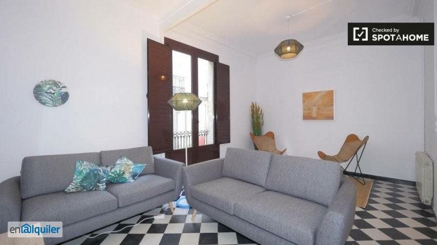 ** El gigante chic ** _Porque quiero hacer amigos en una ubicación de eventos_ ** ¿Me gustará aquí? ** Eso depende. ¿Eres un buen vivero que busca un lugar en un barrio romántico del Barça? Tienes suerte, este podría ser perfecto para ti. **¿De Verdad? Dime más...** Te encantará la decoración. Muebles de estilo, suelos con estampados funky, y cuentan con iluminación. Eso, más 6 nuevos compañeros de piso para explorar la ciudad. ¿Qué más podrías querer? Creemos que este apartamento es perfecto para profesionales extrovertidos, o tal vez una familia que busca mucho espacio. Explore las calles laberínticas de Barri Gòtic y aplaste con fuerza la sombría arquitectura neogótica. ** Sus 3 razones principales para vivir aquí: ** - La sala de estar está lista para una velada elegante. - La decoración moderna. Me encantan los muebles de estilo escandinavo. - El Mercat de La Boquería se encuentra a 9 minutos a pie. ** Pero necesitas saber esto ... ** - No hay aire acondicionado. ¿Es hora de invertir en un fan? **Y esto...** - ¡Se permite fumar! Pero solo en las habitaciones. Pero mejor que nada, ¿verdad? - Se permite un par de mascotas pequeñas en la propiedad, solo debe ser administrada por el propietario primero. ** Nuestro Homechecker, Xavi, dijo: ** _ "Me encantó esta propiedad. La ubicación es excelente y las habitaciones son amplias. No te puedes equivocar con este ". _ ** Dame esto directamente ... ** Este es un increíble apartamento de 7 dormitorios en el 1er piso en Carrer Del Palau, Barcelona. Cuenta con una sala de estar fresca, una decoración elegante y está cerca de algunos de los mejores restaurantes de la ciudad. Pensamos que es ideal para un grupo de jóvenes profesionales. Barri Gòtic está lleno de encantadores agujeros en las paredes que esperan ser descubiertos por flaneurs desprevenidos. Los fumadores y los amantes de los animales también les encantará aquí, ya que puede fumar en las habitaciones y traer a su mascota (pequeña).