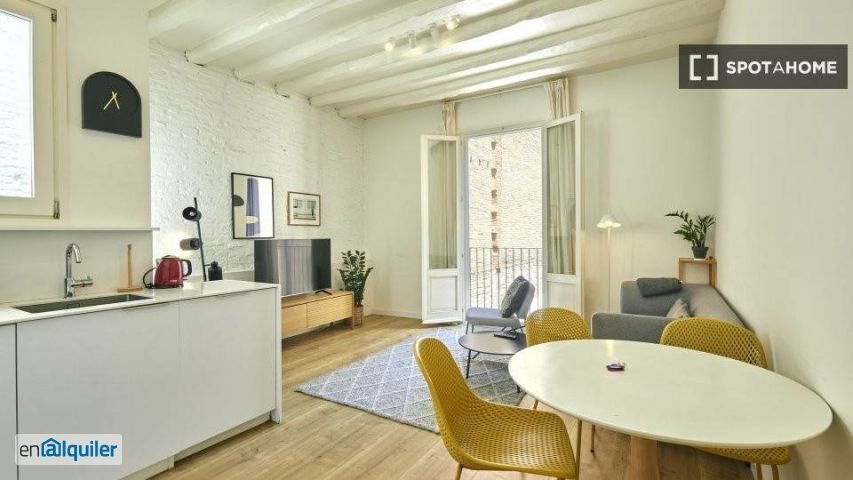 Bienvenido a este encantador apartamento de 2 habitaciones situado en el animado barrio de Sant Pere Santa Caterina i la Ribera, Barcelona. La propiedad está completamente amueblada y cuenta con cocina equipada con electrodomésticos modernos, calefacción central, aire acondicionado individual y wifi incluido en el precio del alquiler. Los residentes apreciarán la lavadora privada y el balcón/terraza, lo que aumenta su comodidad y conveniencia. Este apartamento es adecuado para personas de cualquier género, profesionales, parejas, familias, estudiantes y Erasmus, y ha sido revisado personalmente por Spotahome para garantizar su calidad. Sant Pere Santa Caterina i la Ribera ofrece un ambiente vibrante, lleno de historia y cultura. Entre las atracciones cercanas se incluyen el Pasaje Sert, la Escultura Carmela, la Glorieta de la Transexual Sonia y la Casa de la Seda, todas a poca distancia a pie. Este barrio artístico ofrece fácil acceso a los lugares emblemáticos y las calles con encanto de Barcelona. Descubre tu hogar ideal en este dinámico barrio.