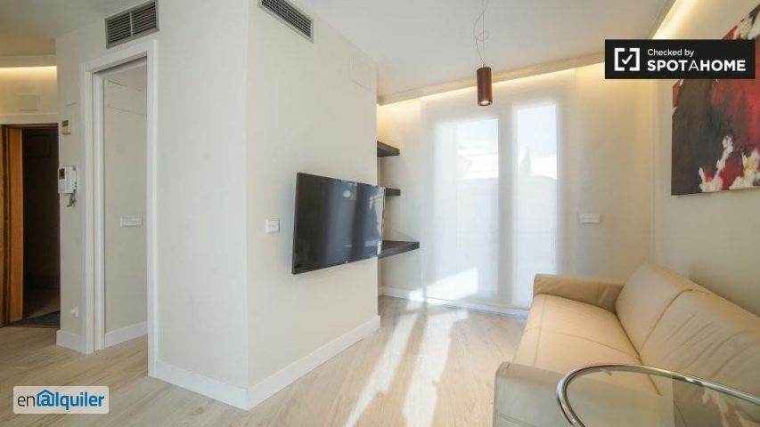 Este elegante estudio se alquila en la zona de Argüelles de Madrid. Hay una hermosa terraza privada fuera del apartamento con asientos románticos para dos. También puede obtener vistas impresionantes de la ciudad desde aquí. Los tonos sutiles decoran la sala de estar, y las obras de arte abstractas en sus paredes. Esta habitación cuenta con una mesa de comedor de madera maciza para dos, un cómodo sofá y una gran TV de pantalla plana. La habitación es una habitación doble cómoda y, de nuevo, presenta una decoración moderna y elegante. Este elegante apartamento está cerca del hermoso Parque del Oeste y cerca del enorme espacio natural de Casa de Campo. Si no estás paseando por estos grandes parques, puedes visitar centros culturales, la magnífica Plaza de España o museos, todos los cuales se encuentran cerca.
