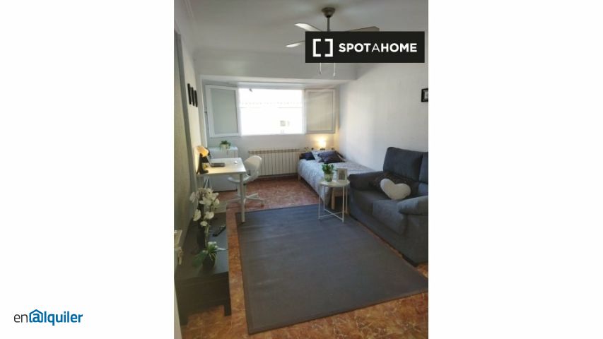 Se alquilan habitaciones en piso amueblado de 4 dormitorios en la c. De Marcelino Unceta. La vivienda se encuentra en la 4ª planta de un edificio sin ascensor. El dormitorio 1 incluye un balcón. Cada habitación incluye su propia mini nevera, ventilador de techo y tv privada.
