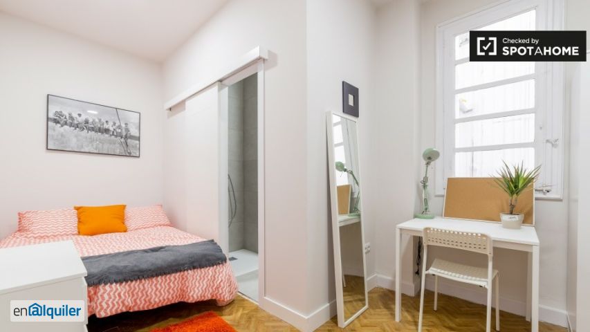 Este fantástico apartamento 5-habitación dispone de habitaciones para alquilar en el céntrico barrio de l'eixample. El apartamento ha sido recientemente renovado a un alto nivel, y cada habitación es espaciosa, con camas dobles, escritorios, sofás, y un montón de espacio de almacenamiento. Hay 2 baños para compartir entre 4 de las habitaciones, mientras que el quinto tiene un cuarto de baño. Los cuartos de baño son todos nuevos, con amplias duchas abiertas, y nuevos accesorios. Hay una gran cocina con gran capacidad de almacenamiento, un horno y una estufa, así como el acceso a un pequeño balcón con líneas para secar la ropa. Usted va a vivir en un distrito central de la ciudad, rodeado de miles de tiendas, cafeterías, bares y restaurantes. No te faltará un lugar para ir a dar un bocado para comer, o para comprar algunos comestibles de última hora. De Valencia Estació del Nord está a pocos minutos a pie, y hay varias estaciones de metro cerca, junto con una gran cantidad de rutas de autobús. En la zona también se puede encontrar la plaza de toros, varios museos y el imax, cerca de los Jardines del Turia.