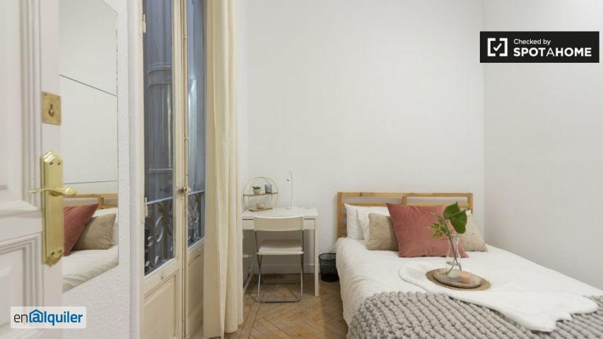 Situado en la calle Preciados, a la vuelta de la esquina de Callao y Gran Vía, 12 confortables habitaciones están disponibles para alquilar en un gran apartamento de 12 dormitorios y 3 baños. El gran apartamento de 200m2 también consta de una cocina totalmente equipada con dos refrigeradores, una sala de estar y tres baños compartidos. A pocos pasos de la Puerta del Sol y cerca del Palacio Real, usted vivirá en pleno centro de la ciudad, cerca de las principales atracciones de Madrid, tiendas, discotecas y restaurantes, perfectos para los nuevos de la ciudad.