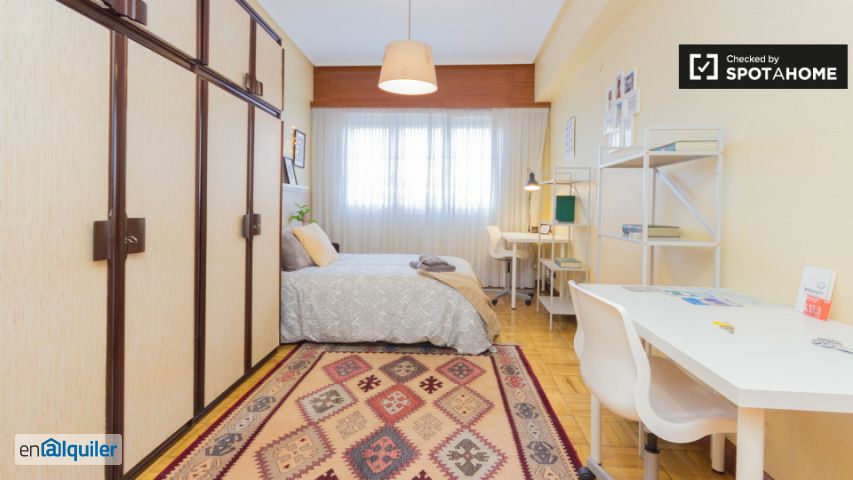 Este apartamento de 91 m², de 3 dormitorios, dispone de amplias y totalmente amuebladas habitaciones disponibles para alquilar a individuos o parejas. El apartamento mezcla su encanto vintage con las comodidades modernas. Hay una acogedora sala de estar donde se puede descansar, ver la televisión, o cenar. La cocina está totalmente equipada y tiene mucho espacio para cada inquilino. Hay 1 baño completo para compartir. El apartamento está en la zona de Ametzola del distrito de Rekalde. Al otro lado de la calle de la estación de tren Ametzola y el parque, está convenientemente ubicado. También hay un montón de tiendas de café, restaurantes y supermercados cerca.