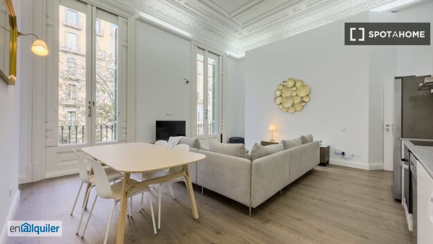 Spotahome presenta este elegante apartamento de 3 habitaciones disponible para alquilar en la Dreta de l'eixample, Barcelona. Este apartamento exterior está bien amueblado, cuenta con una cocina equipada y aire acondicionado individual. También dispone de balcón y lavadora y secadora de uso compartido. No se admiten mascotas ni fumadores, y los gastos de impuestos municipales, luz y agua corren a cargo del propietario. Spotahome ha revisado personalmente el apartamento para su tranquilidad. Ubicado en el barrio de la Dreta de l'eixample, este inmueble está rodeado de numerosos lugares de interés como Oceans Maritime, el Edificio de la Unión y el Fénix, el Monumento al Beat Dr. Pere Tarrés y el Passeig de Gràcia, todos a pocos metros. La Casa Batlló y la Casa Amatller son joyas arquitectónicas cercanas que podrá admirar. Disfrute de una excelente conectividad en esta privilegiada zona de Barcelona.