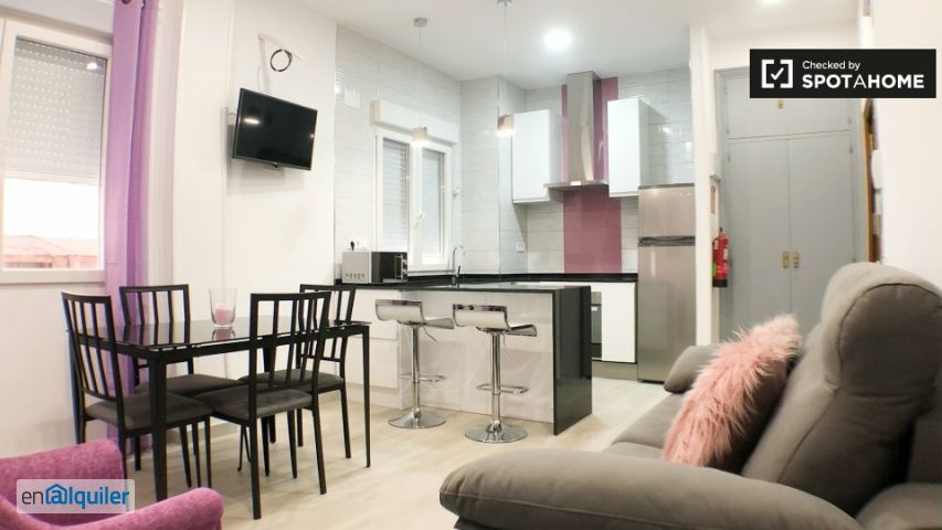 Este apartamento de 1 dormitorio en Chopera, Madrid, ofrece un espacio acogedor y bien amueblado, ideal para trabajadores y estudiantes de posgrado. Está equipado con aire acondicionado individual, calefacción y agua caliente central, y lavadora privada para mayor comodidad. El wifi está incluido en el alquiler, junto con el impuesto municipal y la ropa de cama. Tenga en cuenta que se admiten parejas, pero no se permiten familias, mascotas ni fumar. Gracias al completo proceso de selección de Spotahome, puede confiar en su calidad. Ubicado en Chopera, Madrid, este apartamento está convenientemente rodeado de diversos lugares de interés. Encontrará opciones para comer, como el Bar Tapas, el Restaurante Don José y el Restaurante Mar y, cerca. También encontrará mercados como Alcampo y Supercor. Puede explorar Vidrierafisioterapia y Graffitybefixie para conocer algunas atracciones turísticas. Todas estas características enriquecedoras hacen de Chopera un barrio excelente en cuanto a variedad.