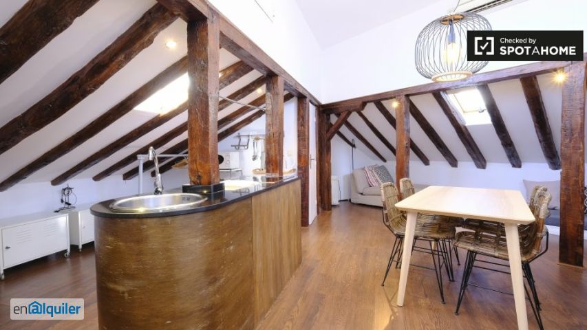 El gato fresco _porque le gusta destacar. _ ¿me gustará aquí? Sí, sí, sí. Es genial, es peculiar, tiene todo lo que pueda necesitar, desde un lavaplatos hasta aire acondicionado. Además, está justo en el corazón de la ciudad. Fueron vendidos. ¿de Verdad? Dime más te va a encantar lo característico que es este lugar. Situado debajo de los aleros del edificio, sus techos inclinados le dan mucha personalidad. Definitivamente se destaca de la multitud. Creemos que esta propiedad es perfecta para cualquier persona que ponga la ubicación ante todo. Al vivir en el Centro, tendrás lo mejor de Madrid justo afuera de tu puerta. Sus 3 razones principales para vivir aquí: - ¡muchas opciones de asientos! Solo cuenta - Estás a minutos del Sol, el centro no solo de Madrid sino de toda España. - ac te salvará cuando llegue el verano. Pero necesitas saber esto - no fumar, lo siento! Y esto - se permiten algunas mascotas, solo consulte con el propietario. Hurra. Ayúdame a decidirme Este es un apartamento de 1 dormitorio en el quinto piso, en la calle Postas, en el centro de Madrid. Es súper acogedor, ubicado en el ático del edificio, con techos inclinados y vigas que lo hacen muy característico. Esta propiedad es ideal si valoras la ubicación. Justo en el centro de la ciudad, es perfecto para explorar Madrid, así como para acceder al transporte y otros servicios. Dueños de mascotas, verifique con el arrendador, su amigo peludo puede reunirse con usted.