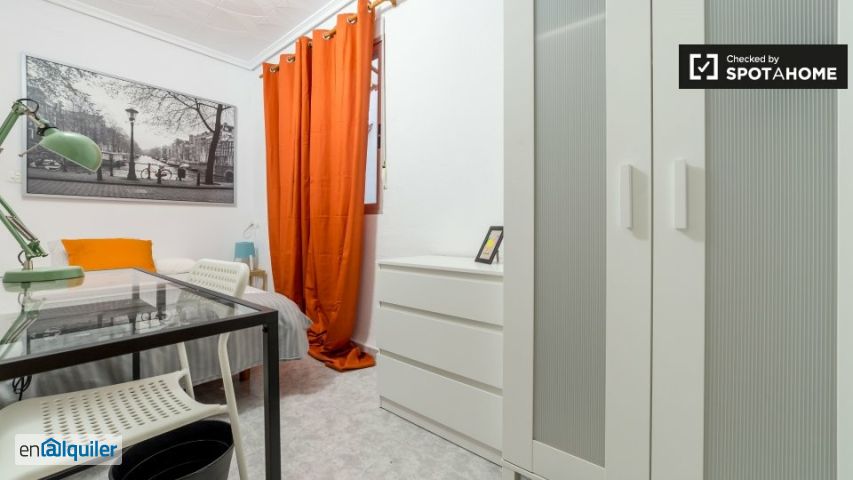 Las habitaciones están disponibles para alquilar en un apartamento de 5 dormitorios en la Saïdia, Valencia. Hay una cocina compartida y 2 baños compartidos. La cocina tiene muchos armarios y estantes de madera y está totalmente equipada con cubertería y vajilla. También tiene un horno, una estufa de 4 quemadores y una lavadora, así como una mesa de comedor y sillas. Los baños tienen inodoro, lavabo y ducha, y uno de ellos también tiene bidet. Cerca del apartamento hay una farmacia, varias tiendas especializadas y un par de bares. Hay una parada de autobús a 3 minutos a pie y una parada de tranvía a 4 minutos a pie.