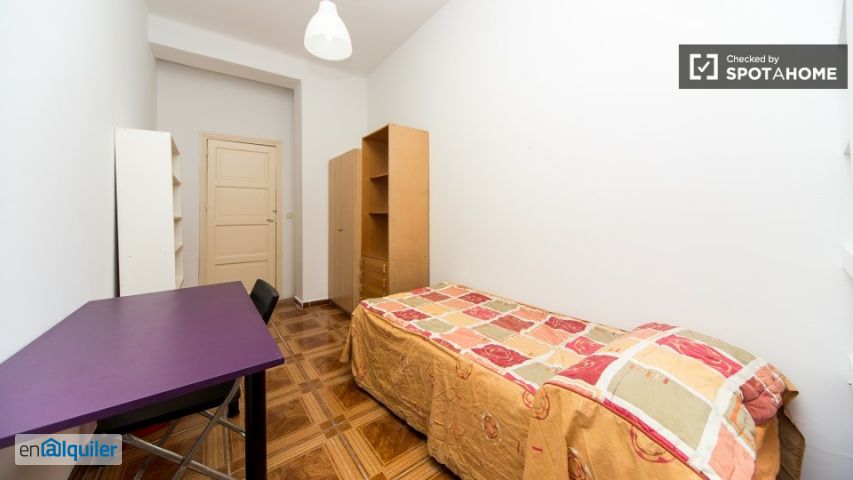 9 espaciosas habitaciones están disponibles para alquiler en un piso compartido grande en el centro de Madrid. El apartamento es de 220m2, y tiene un montón de espacio para los inquilinos para relajarse o pasar tiempo con compañeros de cuarto. La cocina tiene todo lo que los inquilinos puedan necesitar, incluyendo una cocina eléctrica, un horno, un microondas, una tostadora, una lavadora, y una mesa con sillas. La cocina está equipada con vajilla y otros elementos esenciales básicos de cocina. Hay 2 baños compartidos en la propiedad, y 1 de los baños tiene 2 duchas en el mismo. Prepárese para ser golpeado de estrella! La propiedad se encuentra en el famoso barrio de Callao de Madrid. Callao, que es famoso en España por sus extravagantes estrenos de cine internacionales, es el lugar perfecto para echar un vistazo a los actores de Hollywood, futbolistas, y otras personas de notoriedad. Situado porciones cercanas de excelentes restaurantes, centros comerciales, bares y cafeterías, Callao está bien conectado con el transporte público, a poca distancia de varios de los barrios más de moda de Madrid.
